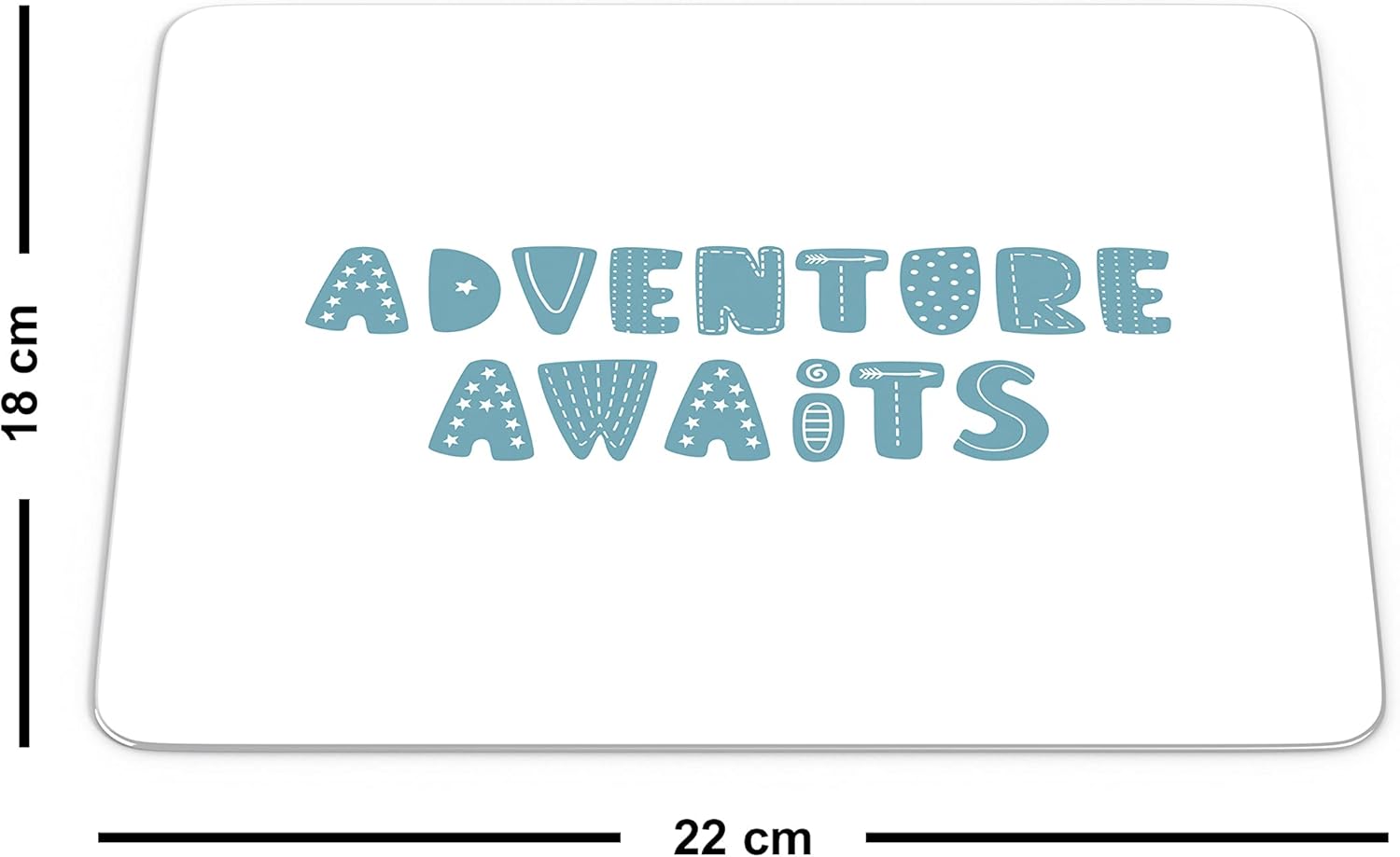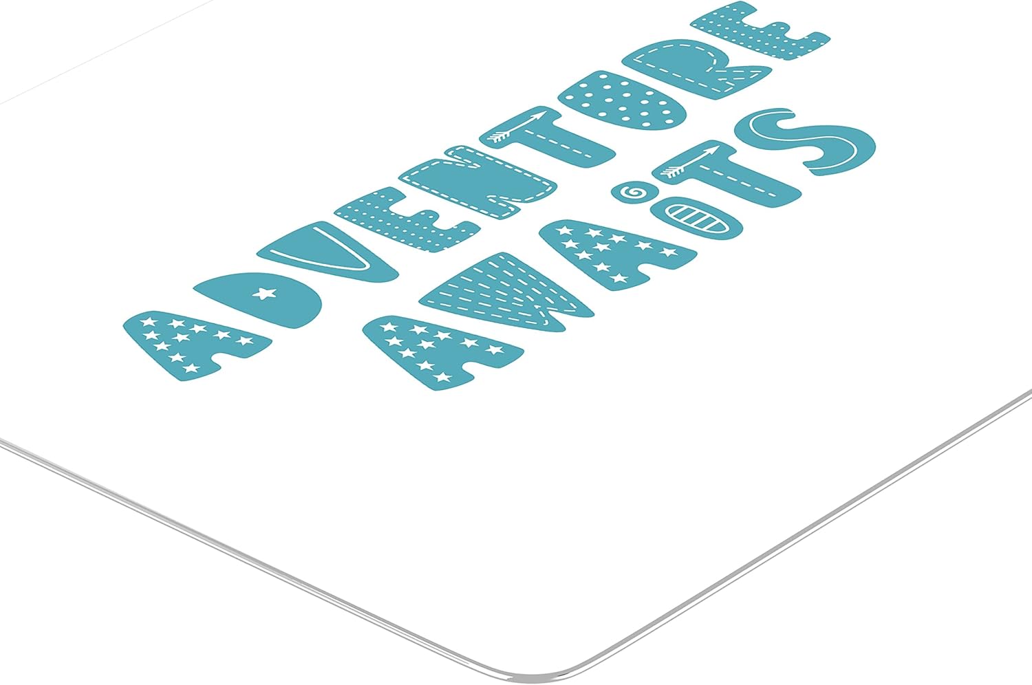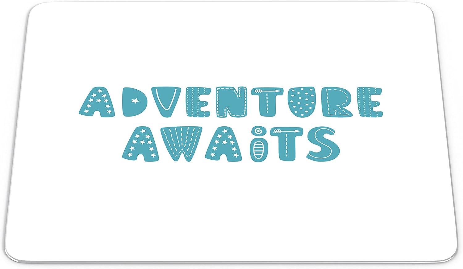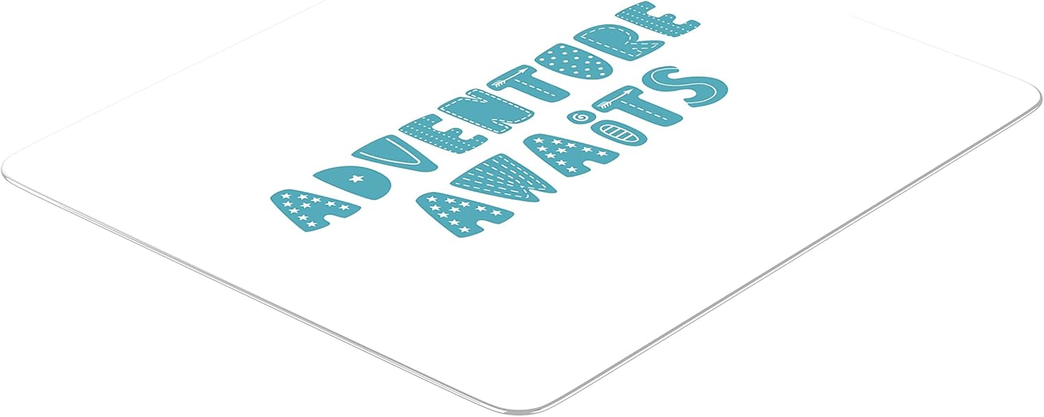 Pregătește-te pentru marea aventură a zilei cu acest mouse pad Adventure Awaits. Designul se remarcă prin literele mari, de culoare albastru-turcoaz, fiecare fiind decorată cu elemente grafice unice: steluțe, puncte, linii și săgeți. Este o piesă decorativă care îndeamnă la curaj și explorare, transformând orice spațiu de lucru într-un punct de plecare către noi idei.