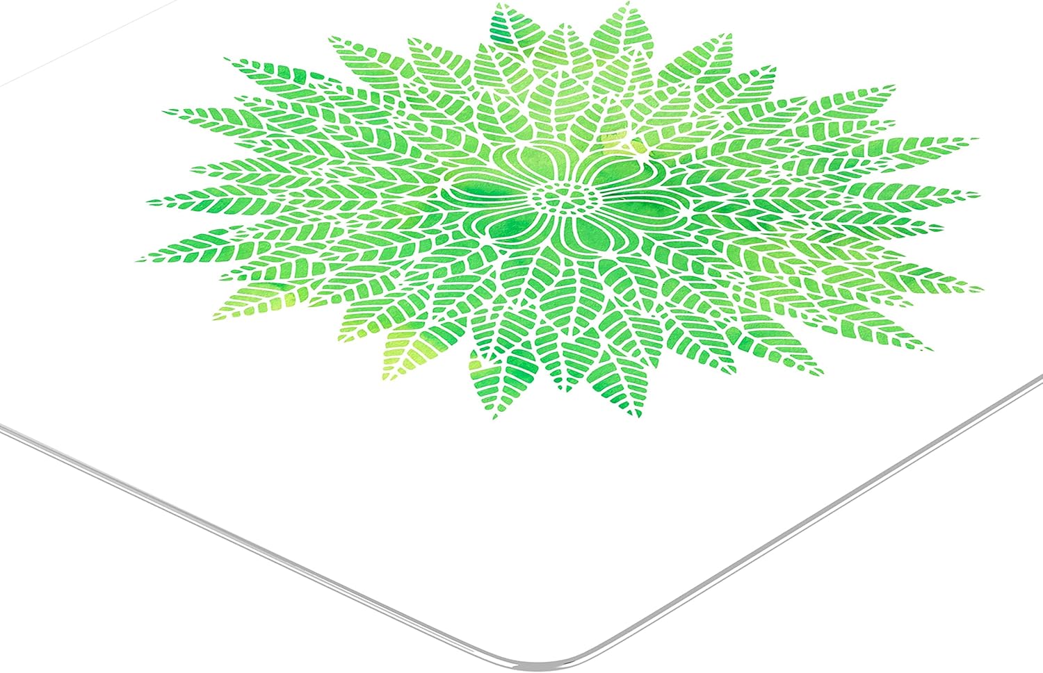 Revigorează-ți biroul cu acest mouse pad mandala verde natural, o piesă deosebită care îmbină geometria sacră cu prospețimea primăverii. Designul prezintă o floare centrală înconjurată de straturi dense de frunze stilizate, conturate prin linii fine albe care îi conferă un aspect aerisit și elegant.