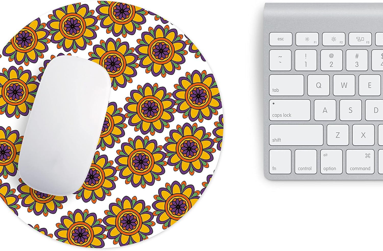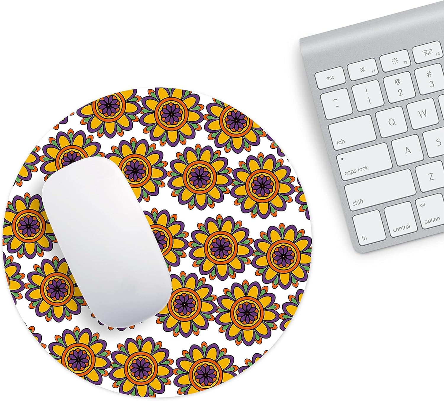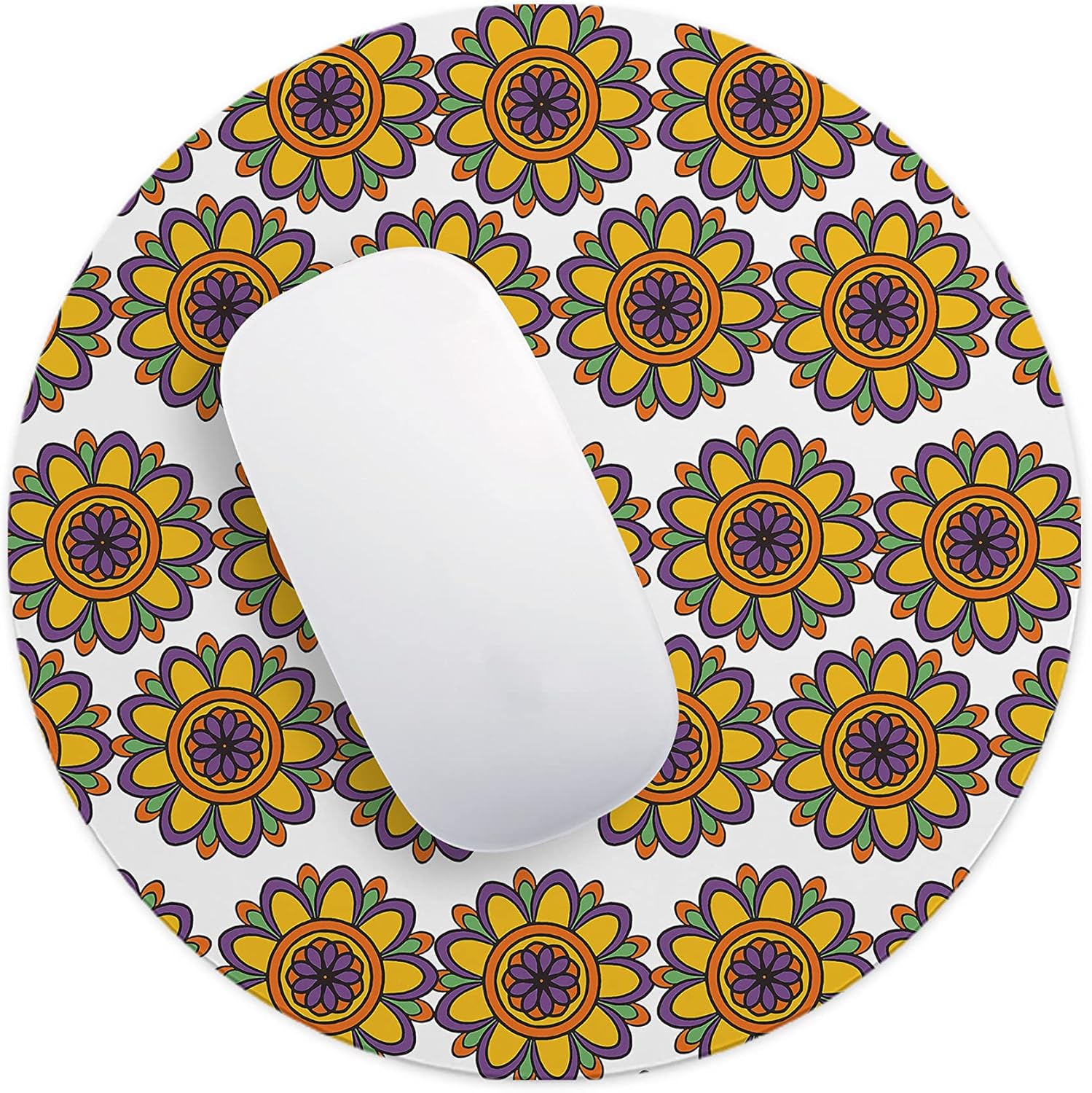 Mousepad-ul rotund de 22 cm, cu un design floral tip mandala în culori vibrante, aduce energie și personalitate spațiului tău de lucru. Suprafața netedă permite mișcări precise și fluide ale mouse-ului, fiind potrivit pentru activități zilnice, birou sau gaming ocazional.