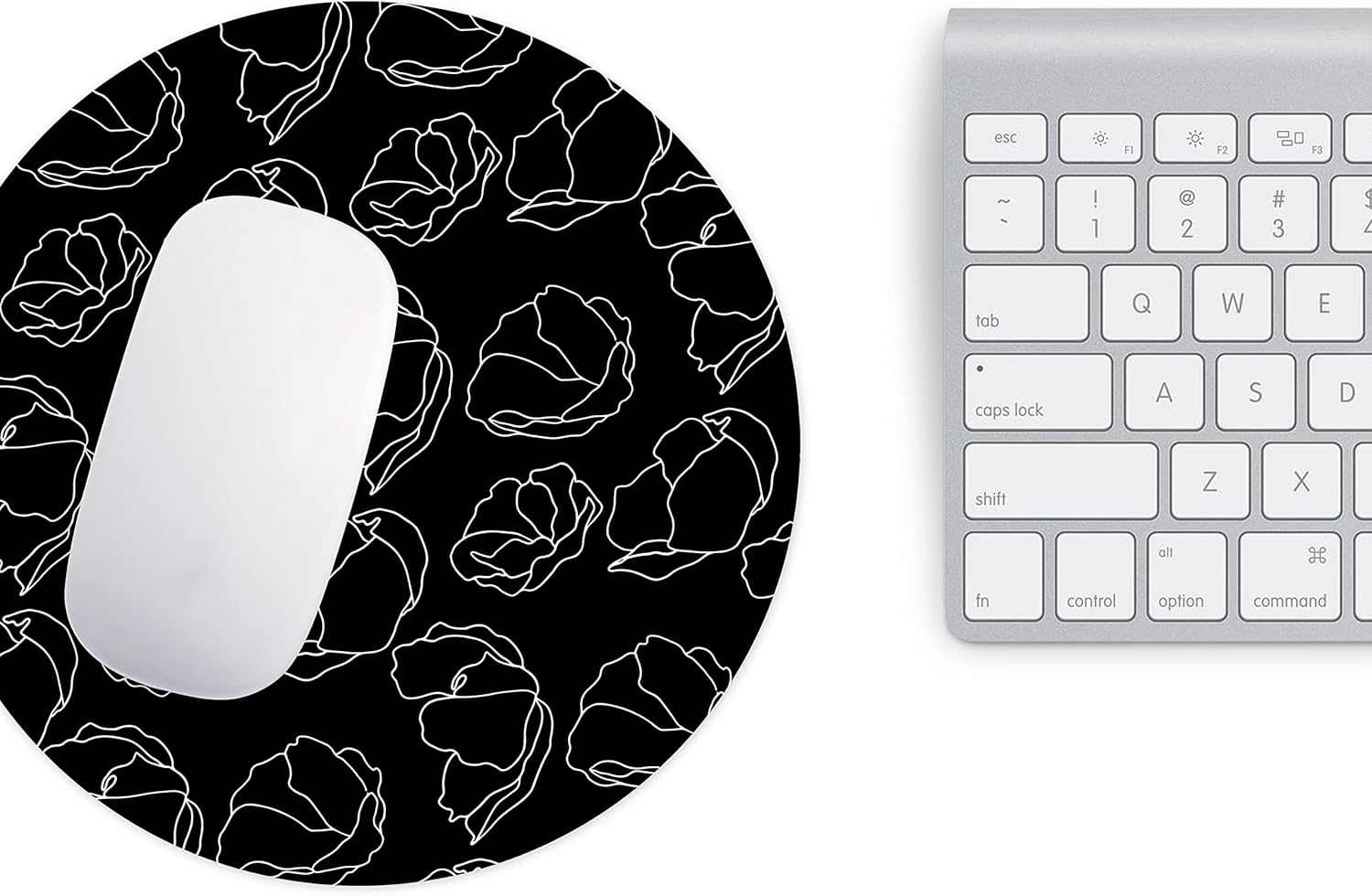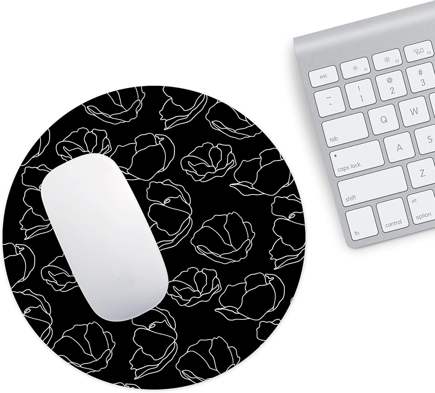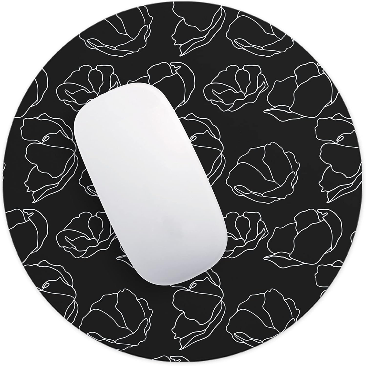 Mousepad rotund cu diametrul de 22 cm, în culoare neagră, decorat cu un model floral alb stilizat, elegant și modern. Designul minimalist îl face potrivit atât pentru birouri profesionale, cât și pentru spații de lucru creative sau setup-uri de gaming. Contrastul alb-negru oferă un aspect rafinat și ușor de integrat în orice decor.