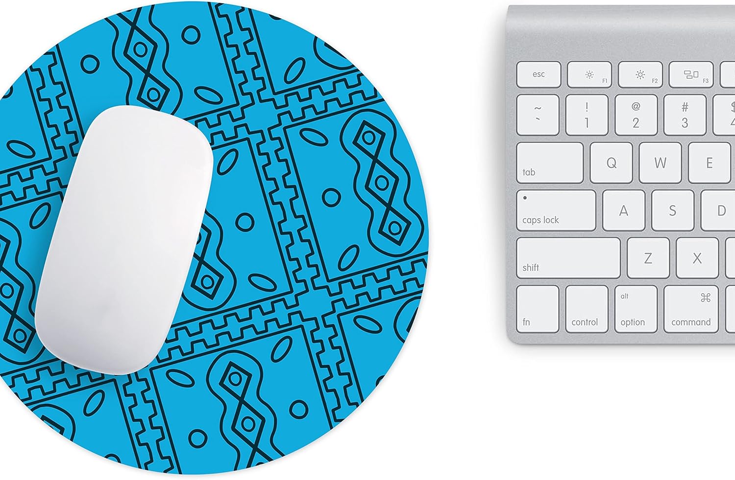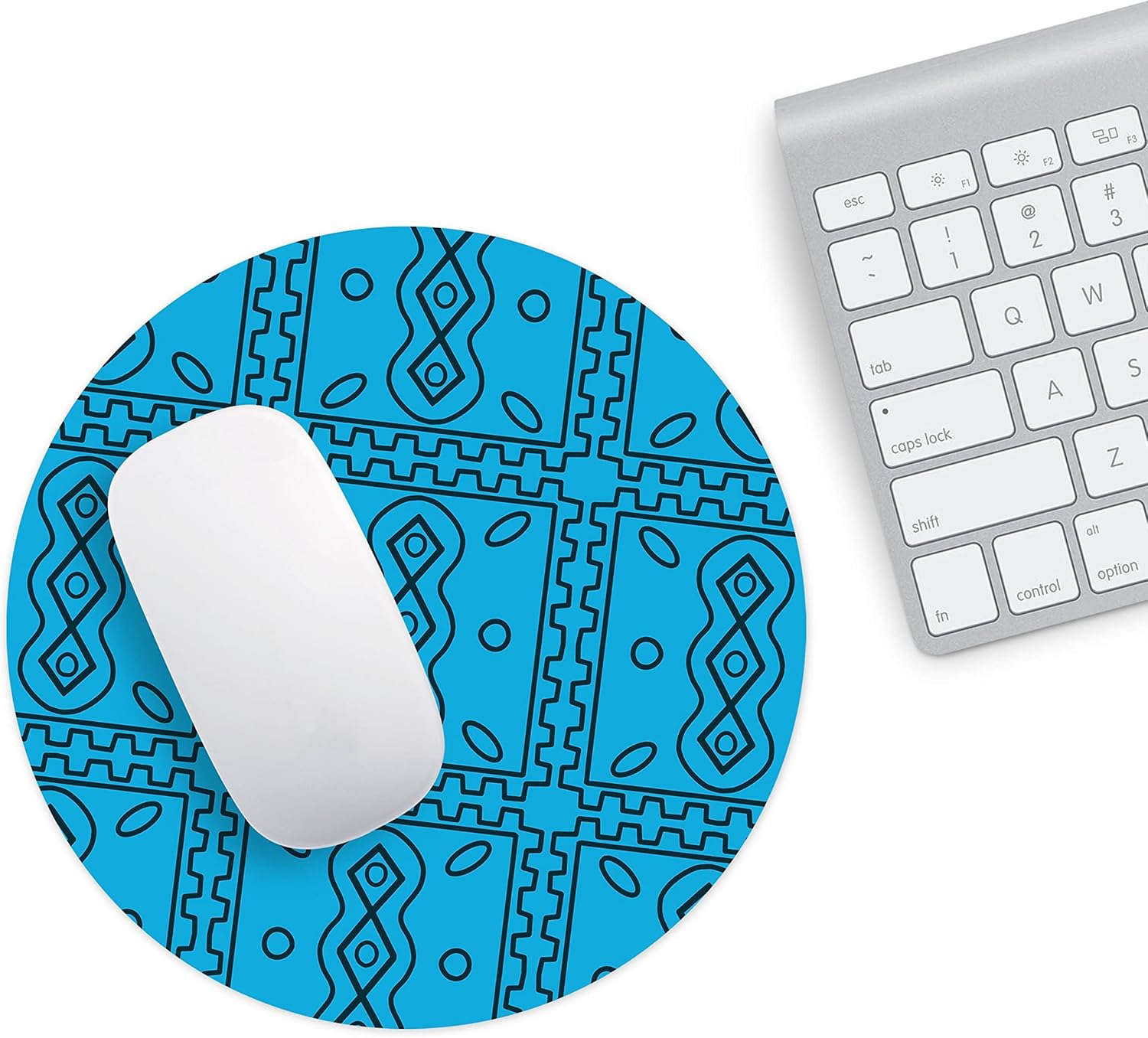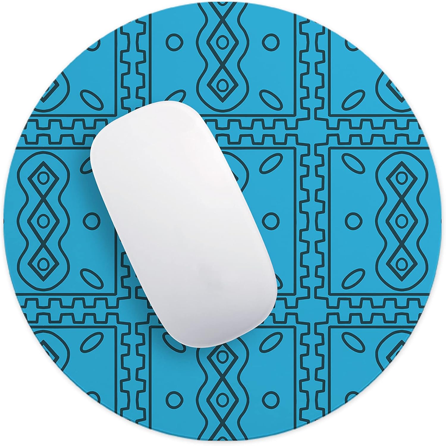 Adaugă un plus de caracter biroului tău cu acest mousepad rotund albastru. Modelul său geometric complex, inspirat din arta tribală și formele simetrice, oferă un contrast vizual puternic pe fundalul cyan vibrant. Este accesoriul perfect pentru cei care caută un echilibru între estetica modernă și funcționalitatea de top.
