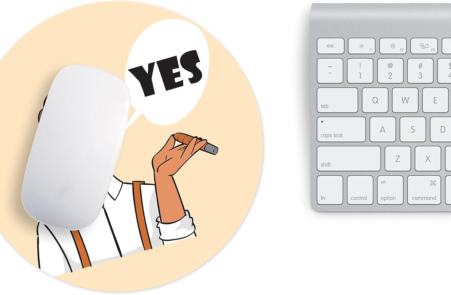 Dă o replică plină de încredere rutinei zilnice cu acest mousepad rotund Yes. Ilustrația prezintă un personaj masculin stilizat, cu barbă și bretele, într-o ipostază relaxată care transmite succes și atitudine pozitivă. Fundalul bej cald și liniile clare de contur fac din acest accesoriu o piesă centrală pe orice birou, atrăgând privirile și declanșând conversații.